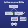 A ballast can be seen as an energy regulator that switches on the lighting. Is there a starter in the fixture? Then this is a conventional ballast (EM). Fixtures with an electronic ballast (HF) don't have a starter. A LED driver can be compared to an electronic ballast and only works with LED lighting.